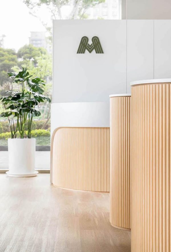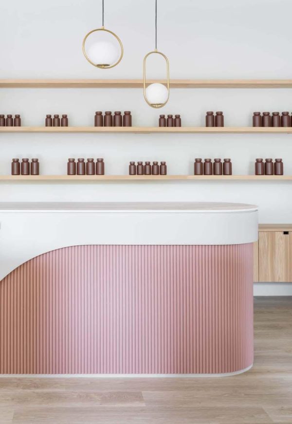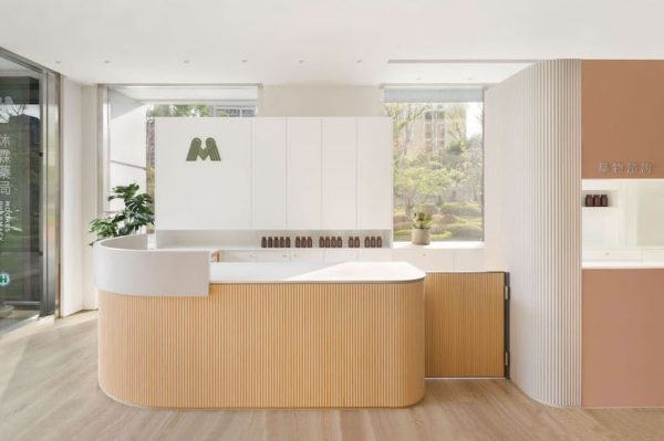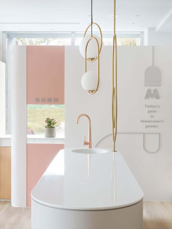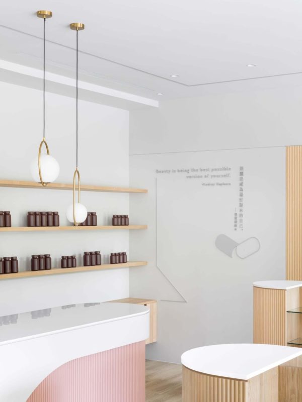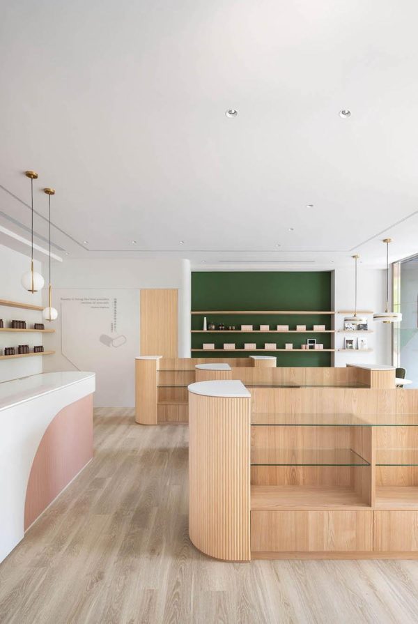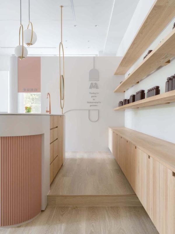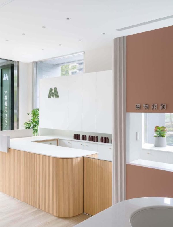 實踐對美好生活的嚮往,打開膠囊走進清新摩登的沐霖藥局,恣意著溫暖的光與迷人的香氣,以新藝術風格的復古曲線串聯整個場域,牆面則以沙漠赭紅搭配茵草綠,呈現出獨特的個性魅力,而溫和木質調展示櫃與愜意優雅的金屬傢俱,落落大方地重新定義藥局面貌,揭開嶄新的體驗空間,提供藥品及健康美學的專業諮詢。轉化若重似輕的白袍羽翼logo設計,傳達用心照護,親切友善地牽起彼此的手,睦鄰氛圍深化與在地的連結。