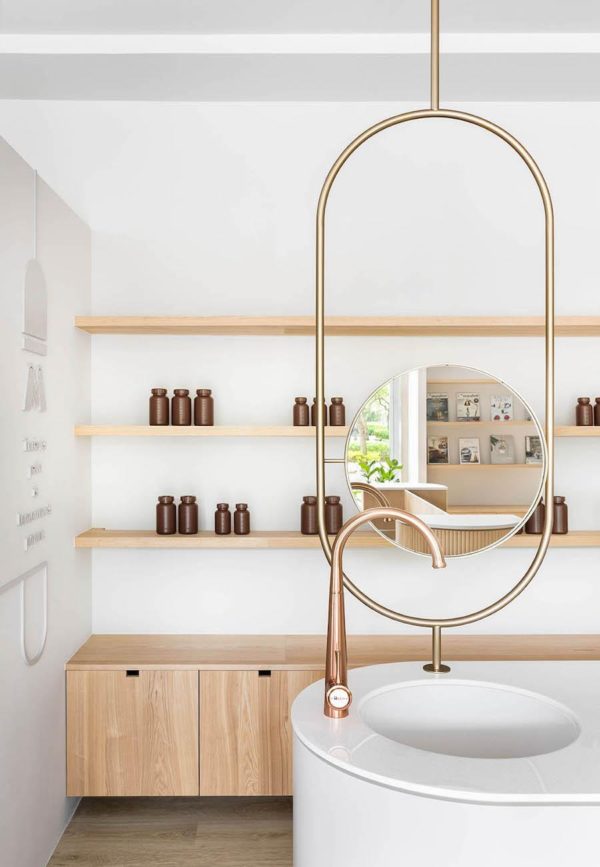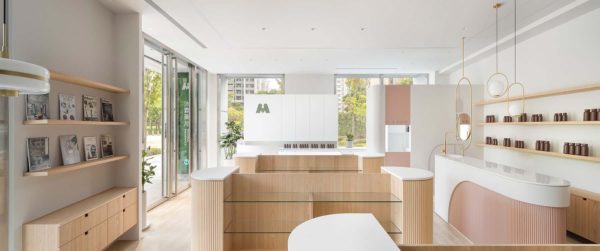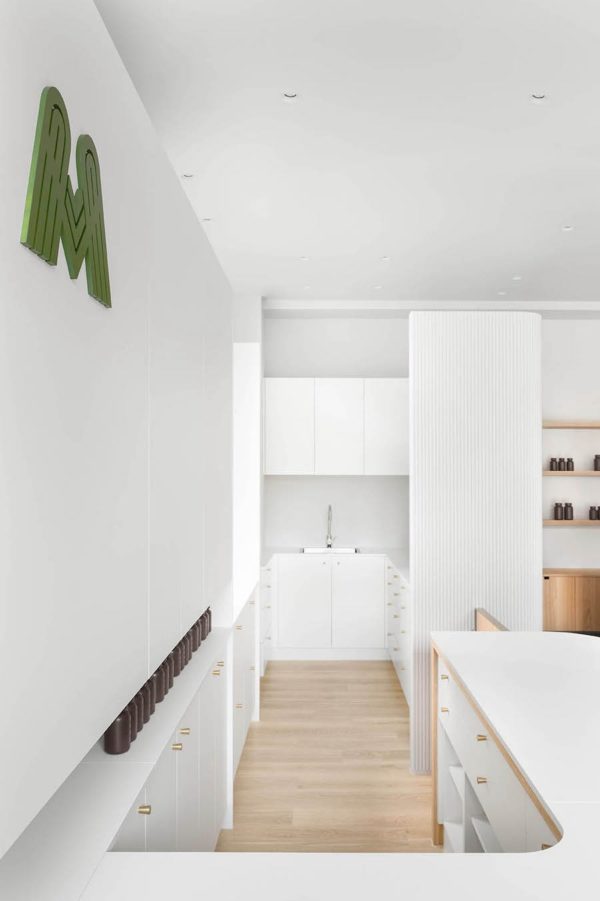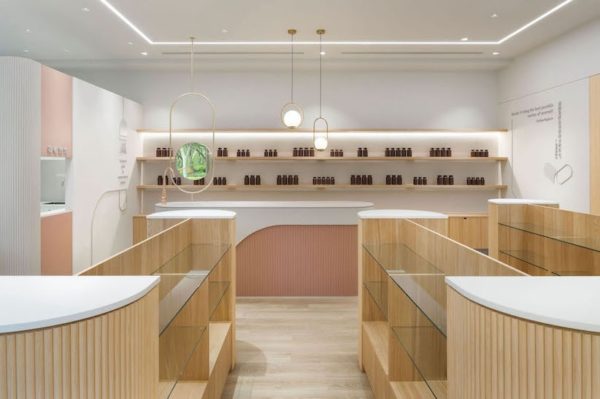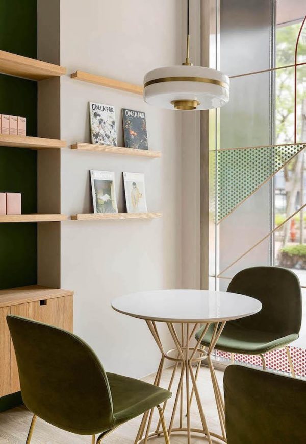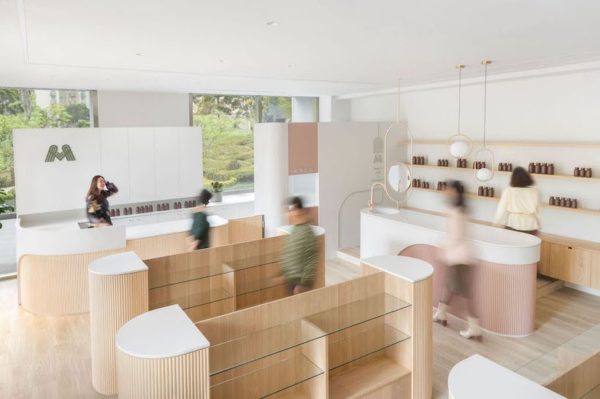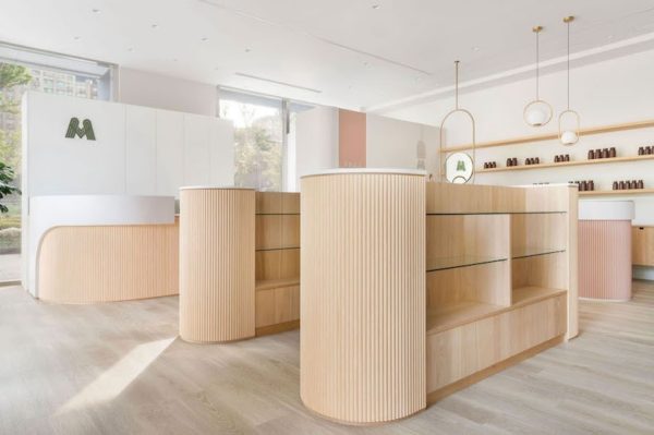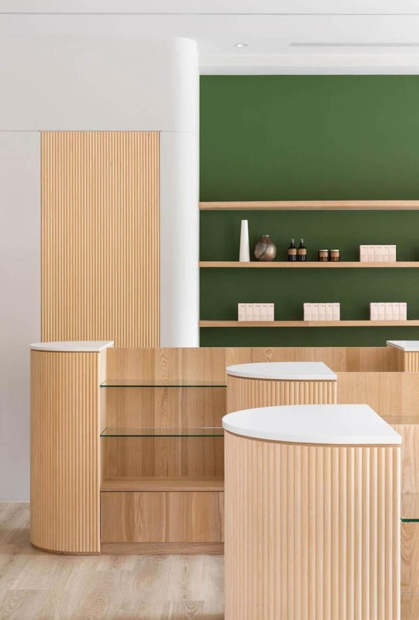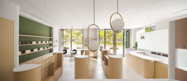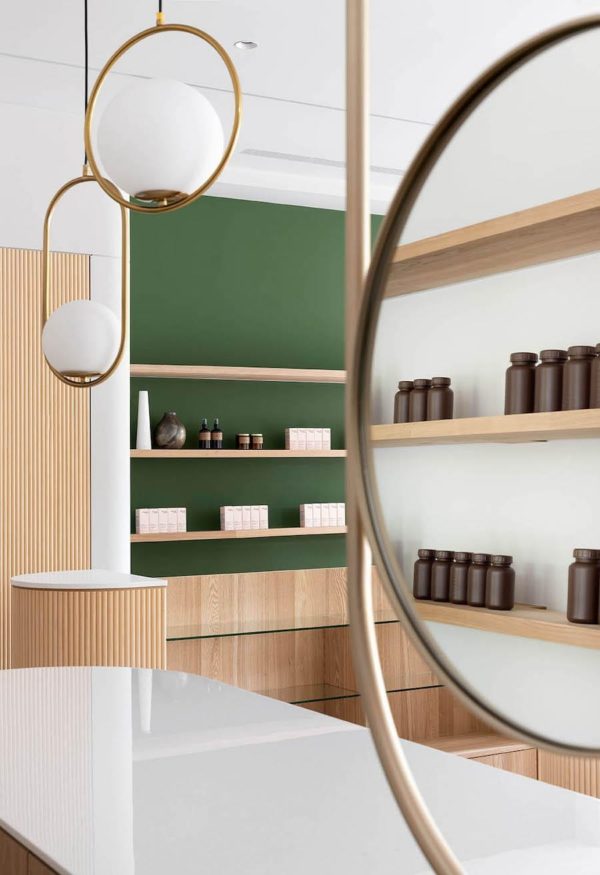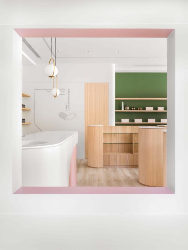 實踐對美好生活的嚮往,打開膠囊走進清新摩登的沐霖藥局,恣意著溫暖的光與迷人的香氣,以新藝術風格的復古曲線串聯整個場域,牆面則以沙漠赭紅搭配茵草綠,呈現出獨特的個性魅力,而溫和木質調展示櫃與愜意優雅的金屬傢俱,落落大方地重新定義藥局面貌,揭開嶄新的體驗空間,提供藥品及健康美學的專業諮詢。轉化若重似輕的白袍羽翼logo設計,傳達用心照護,親切友善地牽起彼此的手,睦鄰氛圍深化與在地的連結。