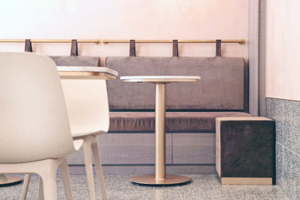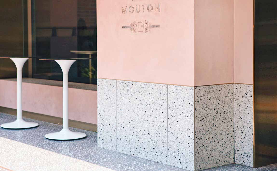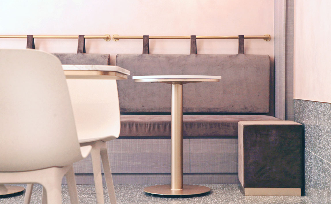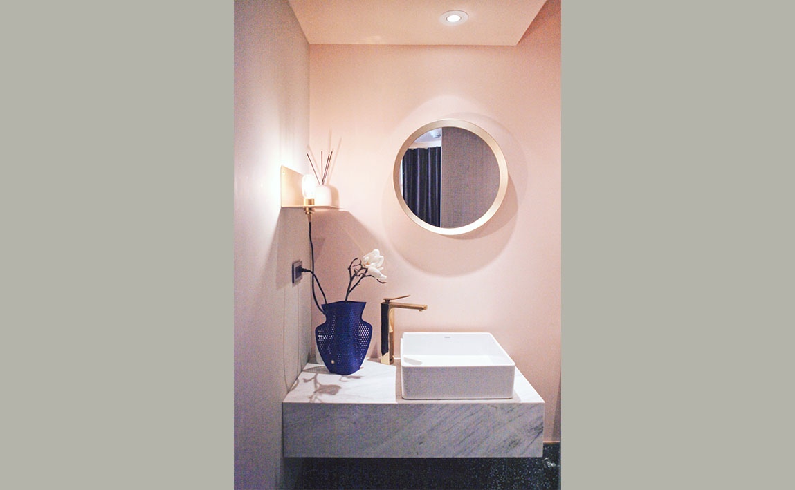 以微觀角度進入奇幻的甜點森林,不造作的自然姿態,整體散發著溫柔的珊瑚粉,嵌入細緻剛毅的金屬飾條,再以紳士般的氣度延展磨石子磁磚。