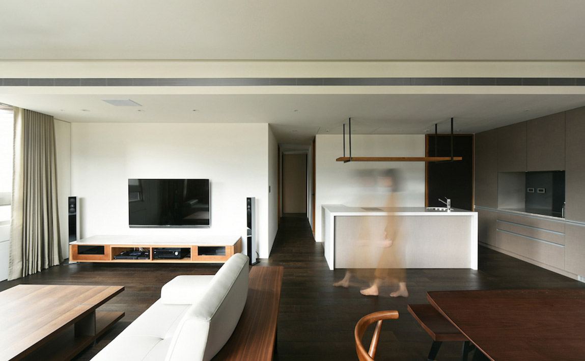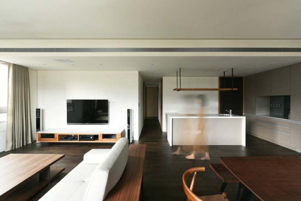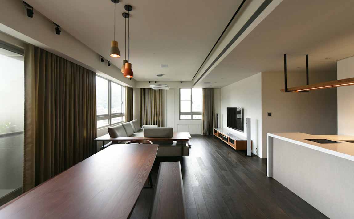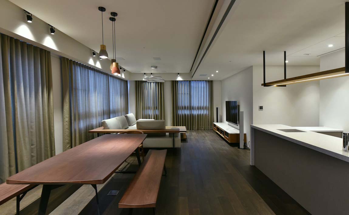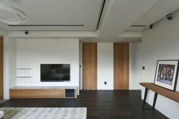 沉靜質樸的雙拼格局,滿足四代同堂的超年齡需求,設計總監Meg化繁為簡,其側為長輩專屬的活動區域,另一側給予晚輩的開放空間,彼此獨立又能互通,亦輕亦重。
