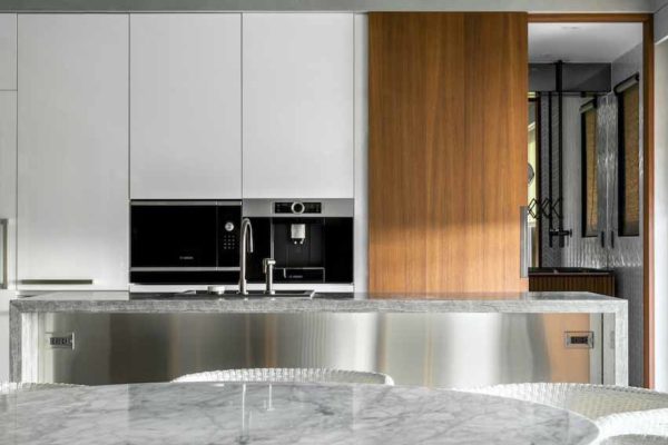 設計總監Meg跳脫框架與極富美學涵養的屋主夫婦,揉合一收一放的佈局,將最美的河岸視野讓渡於開放區域,一明一暗勾勒出層層序列,深邃而細緻的視感,光線隨著空間回字形動線流淌,理性與感性兼容並蓄,圍繞著愉悅傳達出至善至美的追求。
